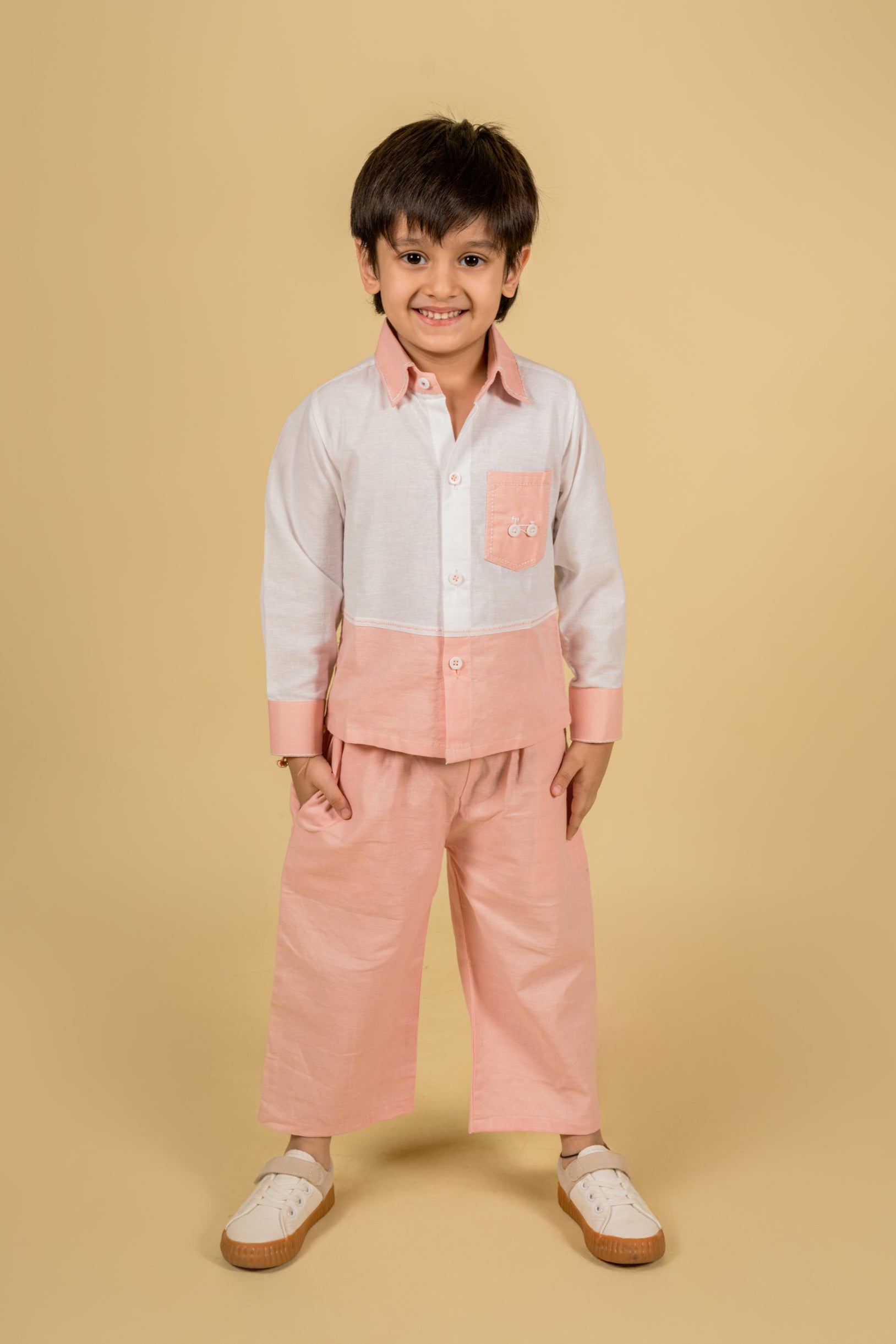 The shirt stands out with its contrast panel design, detailed white anchor stitch lines, and a cute cycle embroidery on the pocket—adding a playful twist to a smart outfit. Paired with wide-fit pants for extra ease and movement, this set is crafted from breathable fabric to keep kids comfortable.
