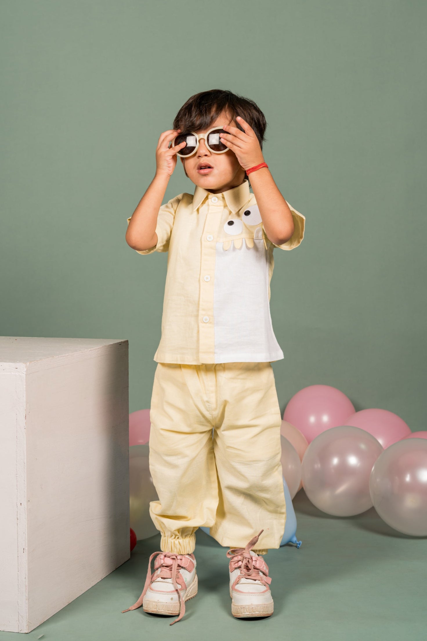 Let your little one shine in our Little Monster Set. The shirt features a smart collar, button-down front, and contrast paneling in pastel yellow and white, with a playful embroidered pocket detail for added charm.